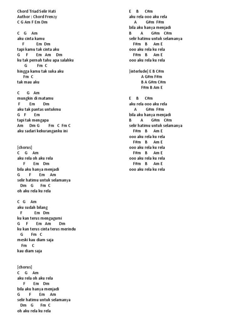 Chord rela hati ini so rela. Am sampai kapan dapat ku tahan G terlanjur besar cinta dan impian. Int Gm F E Gm F E Cm F Gm D Gm luka tape hati. Overtone E B Cm aku rela.
