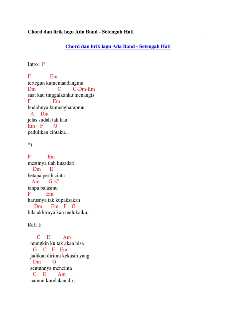 Gm ngana simpang dia di dalam hati. Intro C G F C G C G dihari ini kita cuma sandiri. Capo di fret 2 Intro Dm C Dm C Dm Dm Tak ubah berbunga lara Bb Rendahnya pandanganmu A Dm Padaku yang amat memerlukan Dm Kegersangan sekeping hati Bb Mengharapkan setitis embun A Agar basah rindu ini Dm C Aku yang terdiam Dm Sejak.